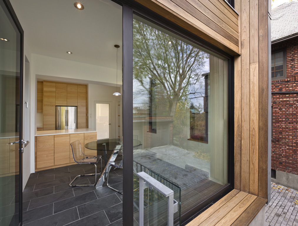 Le volume simple est positionné de manière à respecter l’environnement bâti; l’addition est très proche en taille (volume et superficie) à celle des balcons existants de ces maisons jumelées et elle est centrée sur sa façade. Cet équilibre subtil entre le nouveau et l’ancien, entre la verticalité et l’horizontalité, entre le plein et le vide permet de créer un tout cohérent, préservant l’authenticité existant, tout en affirmant la contemporanéité de l’intervention.